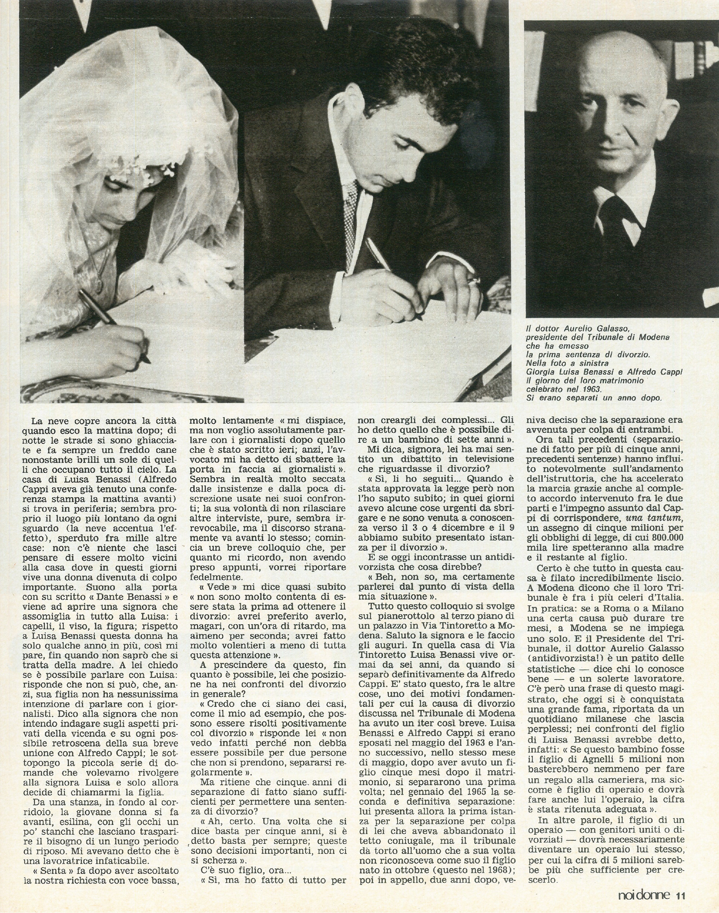 “I primatisti del divorzio”: Adriano Paniccia incontra Giorgia Luisa Benassi e Alfredo Cappi, la prima coppia italiana che, il 29 dicembre 1970, ha ottenuto il divorzio, con la sentenza del dottor Aurelio Grasso, antidivorzista e presidente del Tribunale civile di Modena. Prende così avvio una nuova epoca, segnata da un profondo cambio di mentalità a partire dalla messa in discussione dell’indissolubilità del matrimonio.