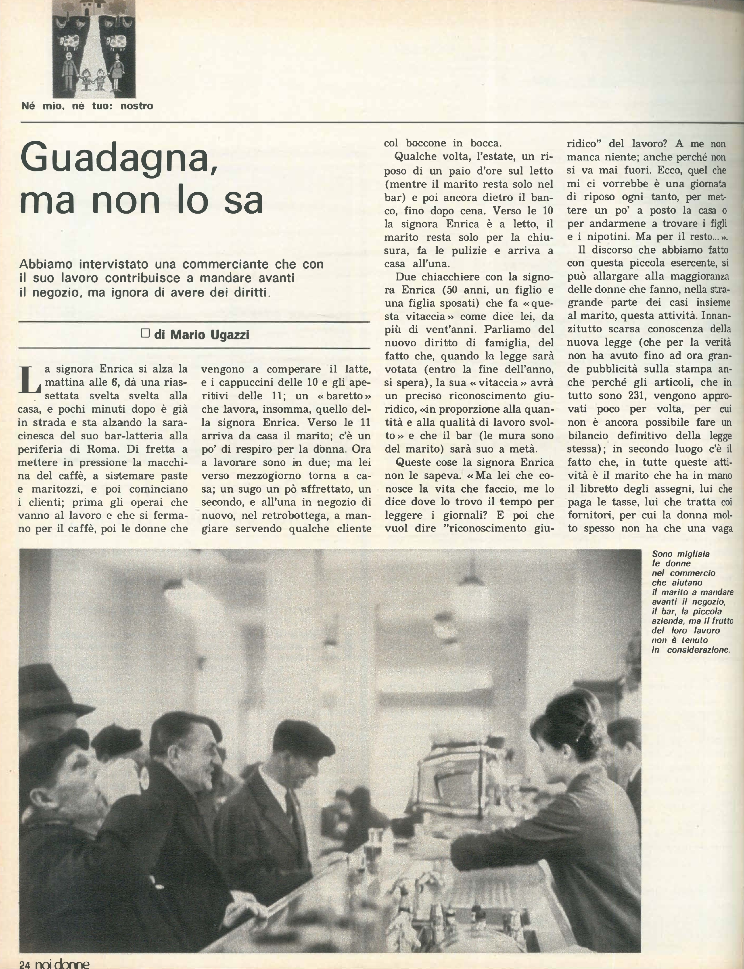 “Guadagna, ma non lo sa”: intervista alla signora Enrica, che con il marito gestisce il bar di famiglia. Solo con la riforma del codice civile i suoi sforzi e la sua dedizione nei confronti di questo lavoro vedranno un riconoscimento giuridico. Articolo di Mario Ugazzi. “Educatrice, amministratrice ed operaia dei fornelli”: il testo della riforma del codice civile stabilisce che moglie e marito, con il matrimonio, acquisiscano gli stessi diritti e doveri e che entrambi debbano condividere in egual modo gli oneri riguardo al lavoro casalingo e all’educazione dei figli.
