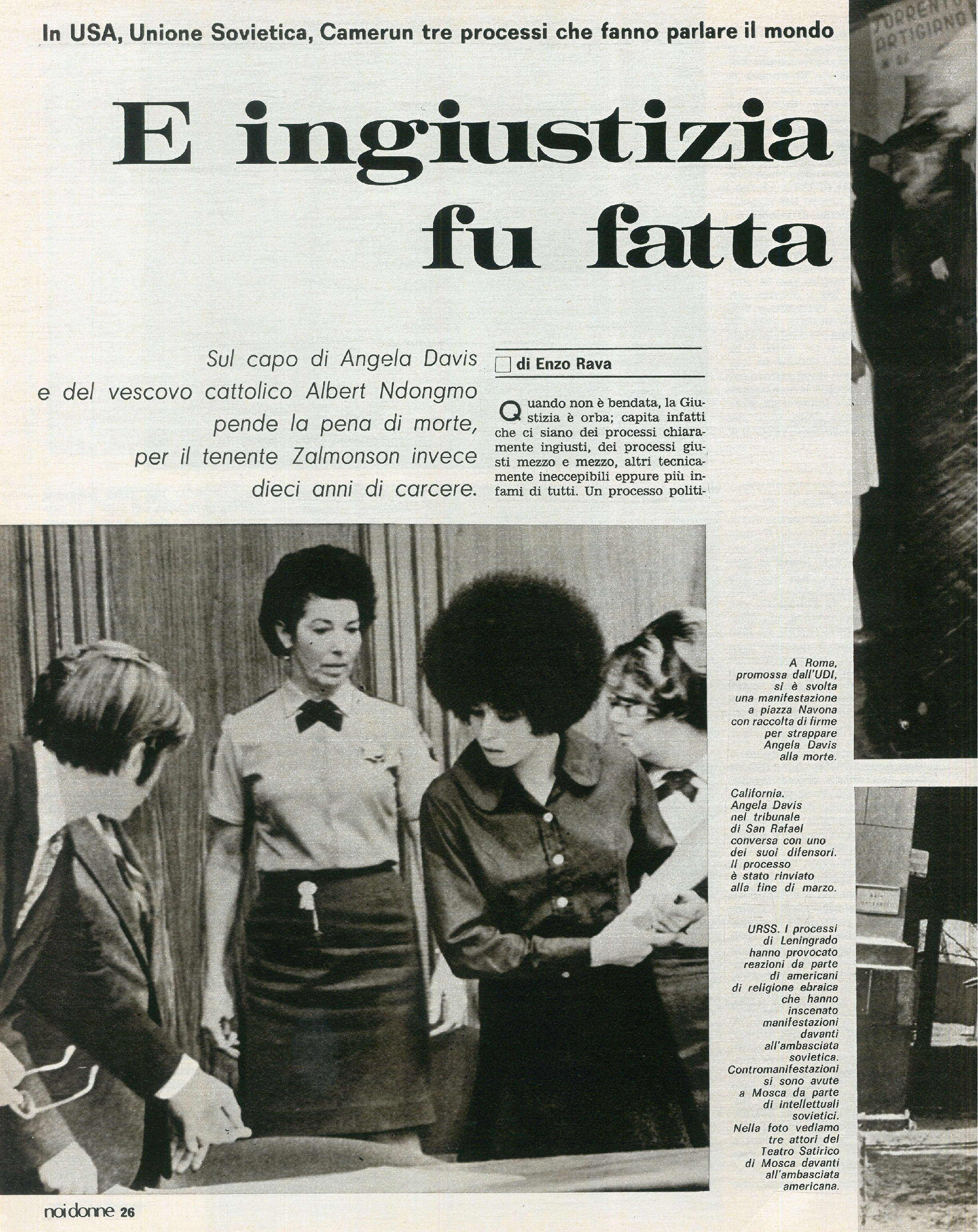 “E ingiustizia fu fatta”: tre processi che fanno parlare il mondo. Il primo è quello svoltosi a Leningrado nei confronti del tenente Wolf Zalmonson, correo di aver tentato il dirottamento di un aereo per fuggire in Israele: la stampa occidentale, indignatasi per quella che è stata definita una persecuzione antisemita in URSS si è molto mobilitata per fare in modo che il tenente non fosse condannato a morte e infatti la condanna si è fermata a 10 anni di carcere. Il secondo processo è quello contro Angela Davis, trascinata in tribunale per delle accuse di omicidio ma nei fatti perseguitata per il suo essere nera e comunista: a marzo il tribunale di San Rafael potrebbe condannarla a morte. Per salvarla dall’ingiustizia razzista si stanno organizzando proteste in tutto il mondo. Il terzo processo si è concluso con la condanna a morte di Albert Ndogmo, vescovo cattolico del Camerun, accusato di aver collaborato con i guerriglieri anti-governativi: abbandonato anche dalla Santa Sede, Ndogmo è morto per mano della giustizia violenta. Articolo di Enzo Rava.