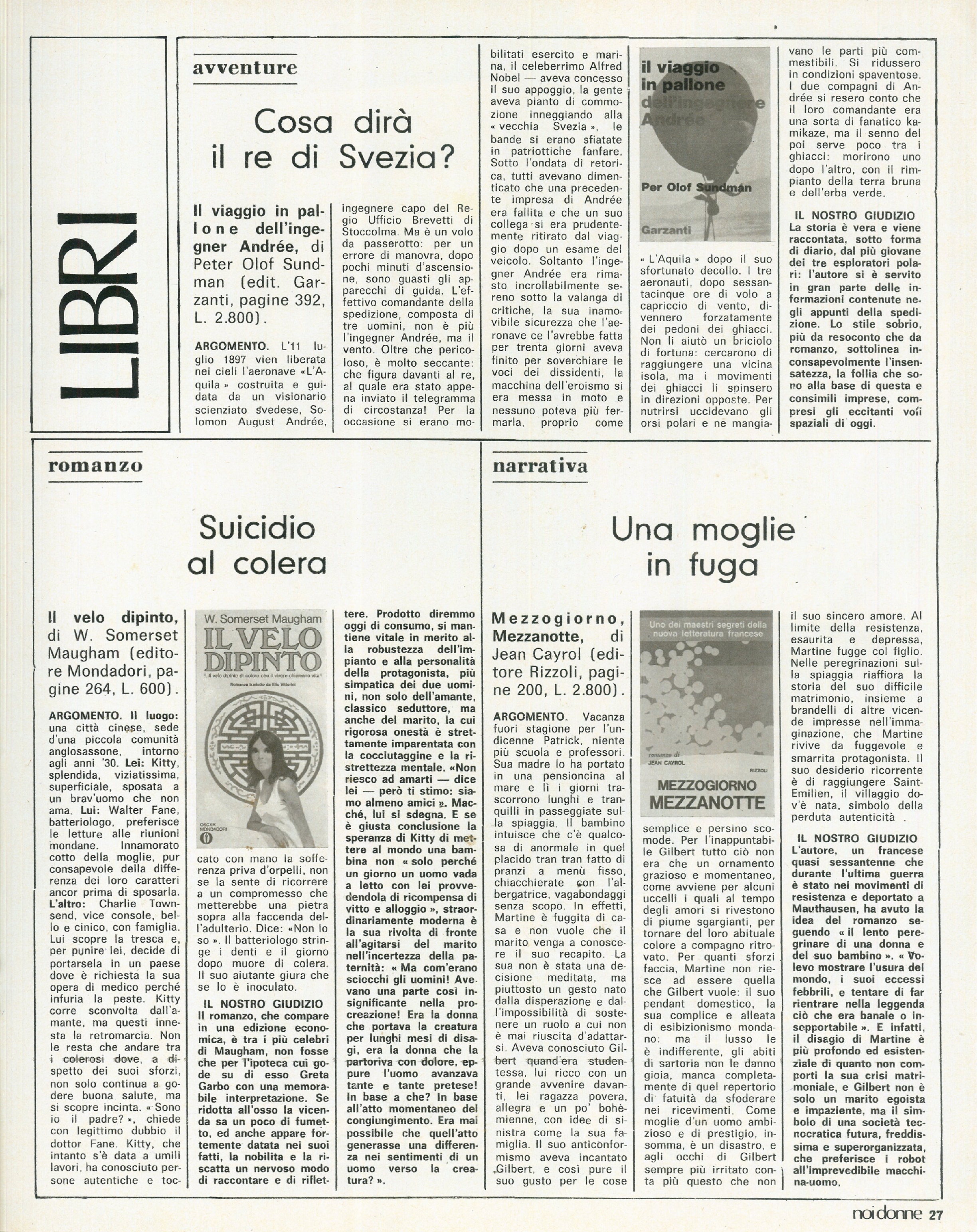 Libri : “Il Viaggio in pallone dell’Ingegner Andrée” di Peter Olof Sundman; “Il velo dipinto” di Somerset Maugham; “Mezzogiorno, Mezzanotte” di Jean Cayrol.
