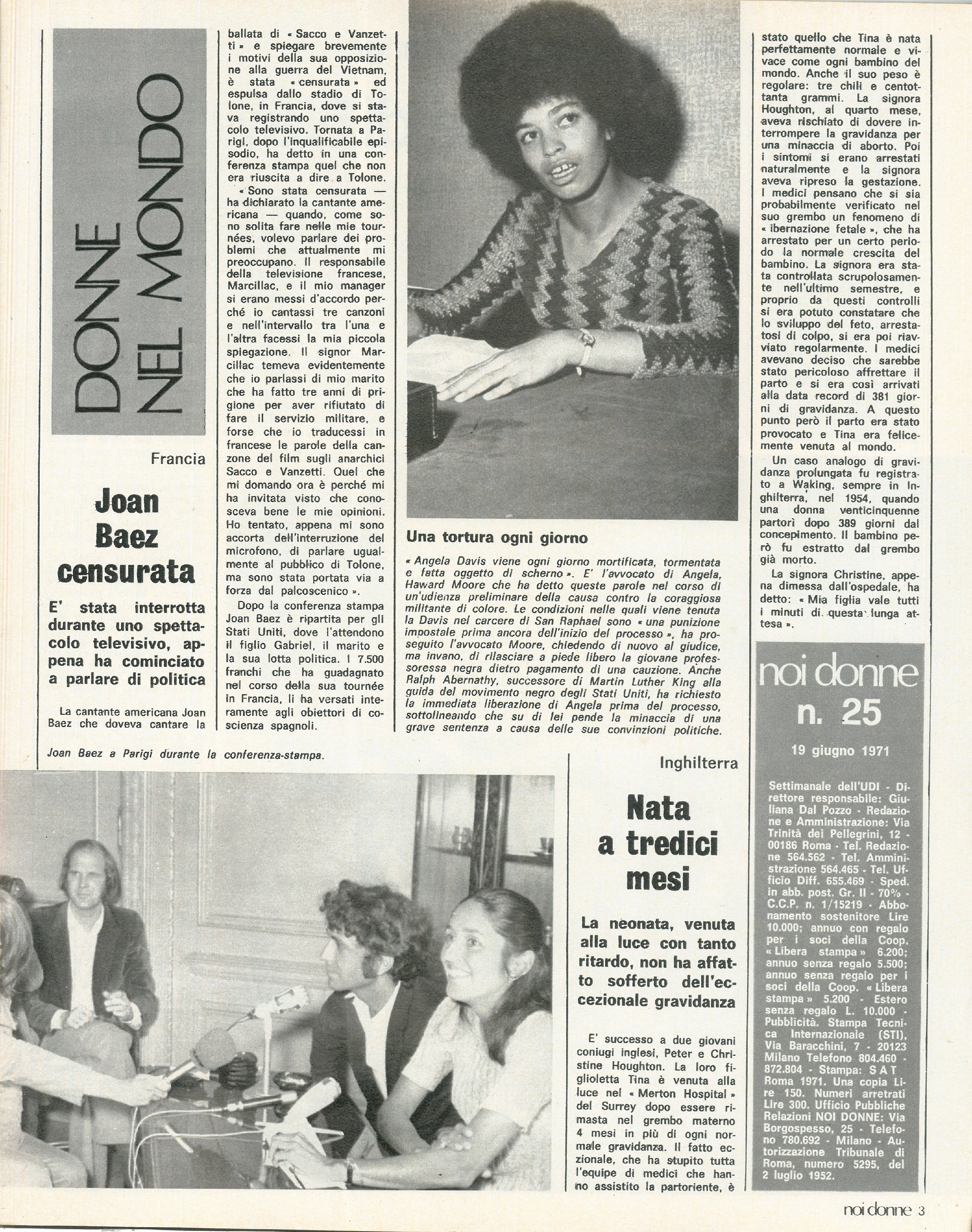 Donne nel mondo, a cura di Giulietta Ascoli: Francia: la cantante Jian Baez è stata interrotta durante uno spettacolo televisivo appena ha iniziato a parlare della sua opposizione alla guerra del Vietnam. USA: Angela Davis continua ad essere tormentata e mortificata in carcere. Inghilterra: la piccola Tina è nata dopo 13 mesi di gravidanza, senza alcun danno alla sua salute. New York: la storia di Gloria, Rachel e Orange dimostra che la città più ricca del mondo isola i cittadini che ritiene di serie B; articolo di Maria Teresa Ravage. Vietnam: la foto che ritrae la tredicenne Vo Thi Lien, una delle poche a sopravvivere al massacro di Song My, testimonia le sofferenze dei bambini vietnamiti. Milano: un gruppo di donne e bambini hanno occupato un edificio dell’Istituto Autonomo Case Popolari per ottenere una casa.