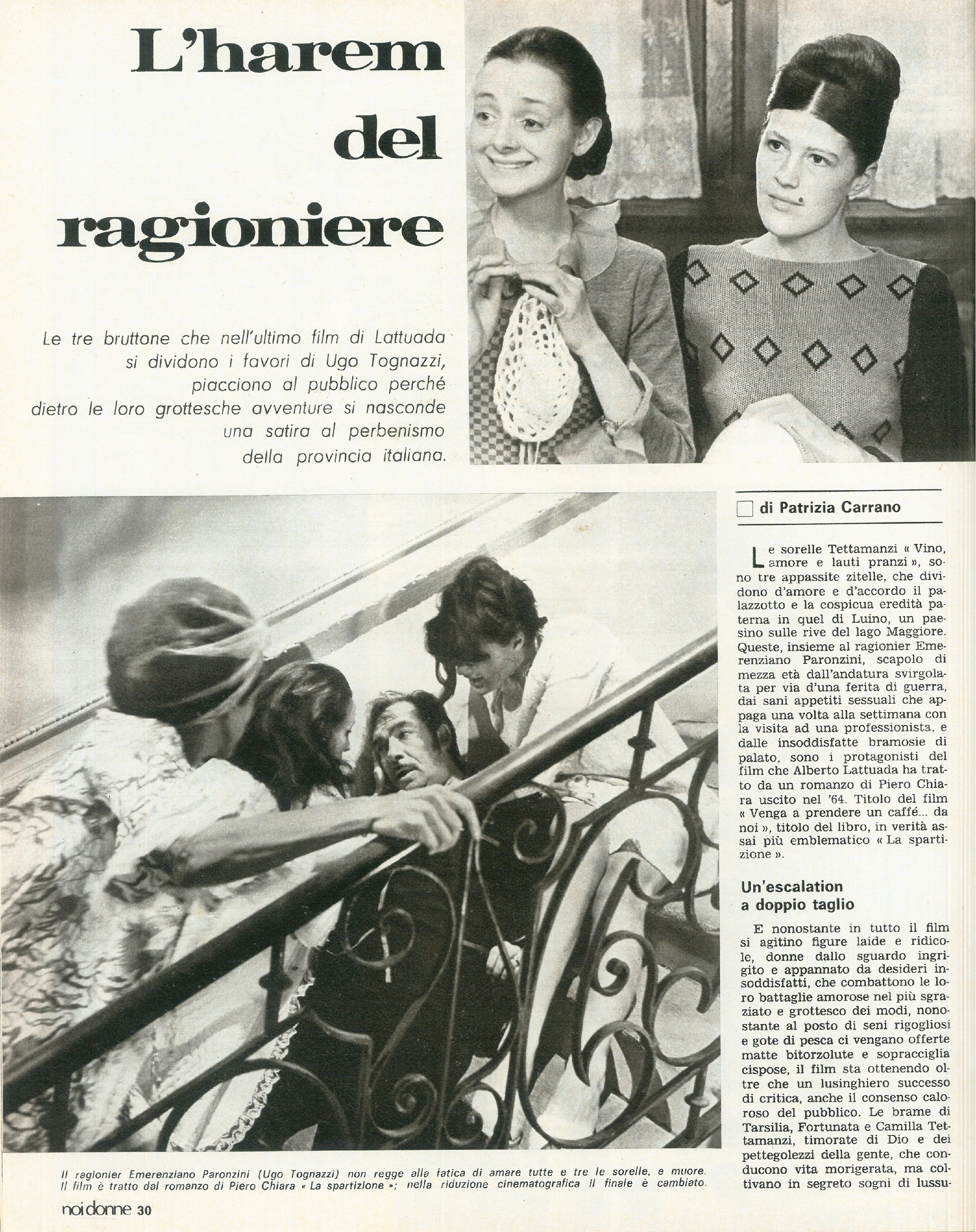 “L’harem del ragioniere“ di Patrizia Carrano: le tre bruttone che nell’ultimo film di Lattuada si dividono i favori di Ugo Tognazzi piacciono al pubblico perché dietro le loro grottesche avventure si nasconde una satira al perbenismo della provincia italiana, il film “Venga a prendere un caffè da noi“ di Alberto Lattuada tratto dal romanzo di Pietro Chiara “La spartizione“ è interpretato da Ugo Tognazzi, Milena Vukotic, Francesca Romana Coluzzi, Angela Goodwin.