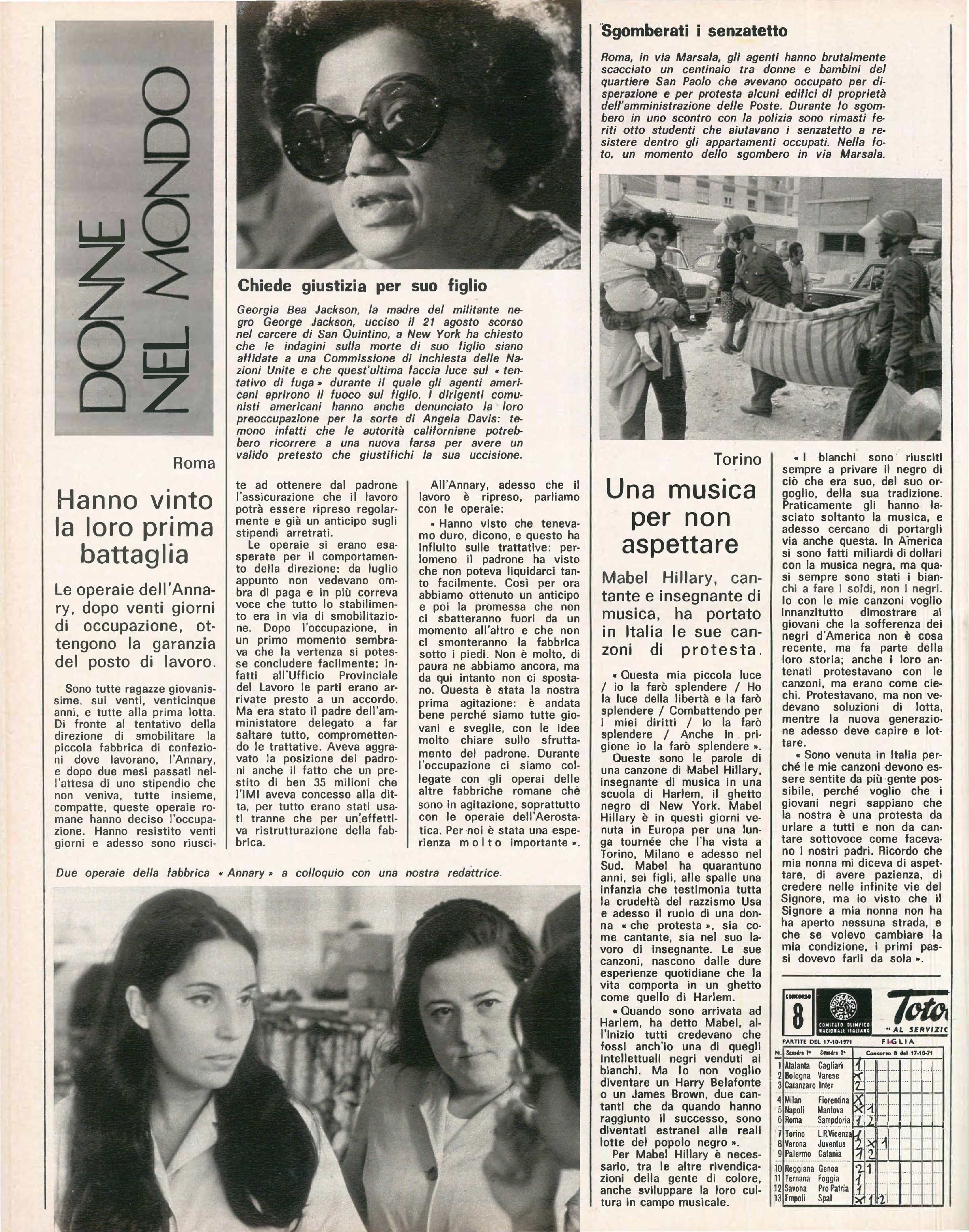 Donne nel mondo: Repubblica Democratica Tedesca: Liane Lang, sindaca di Halle, ha creato nella sua città un asilo nido per 1000 bambini. USA: un “test della saliva” sembrerebbe poter indicare il periodo fertile di una donna. Roma: le operaie dell’Annary, dopo venti giorni di occupazione, vincono la loro battaglia, mantenendo il posto di lavoro. Torino: Mabel Hillary, insegnante di musica in una scuola di Harley, ghetto nero di New York, ha portato in Italia le sue canzoni di protesta. USA: la madre di George Jackson, militante nero, chiede all’ONU di indagare sulla morte di suo figlio. Roma: la polizia ha sgomberato un centinaio di donne e bambini che avevano occupato alcuni edifici del quartiere San Paolo.