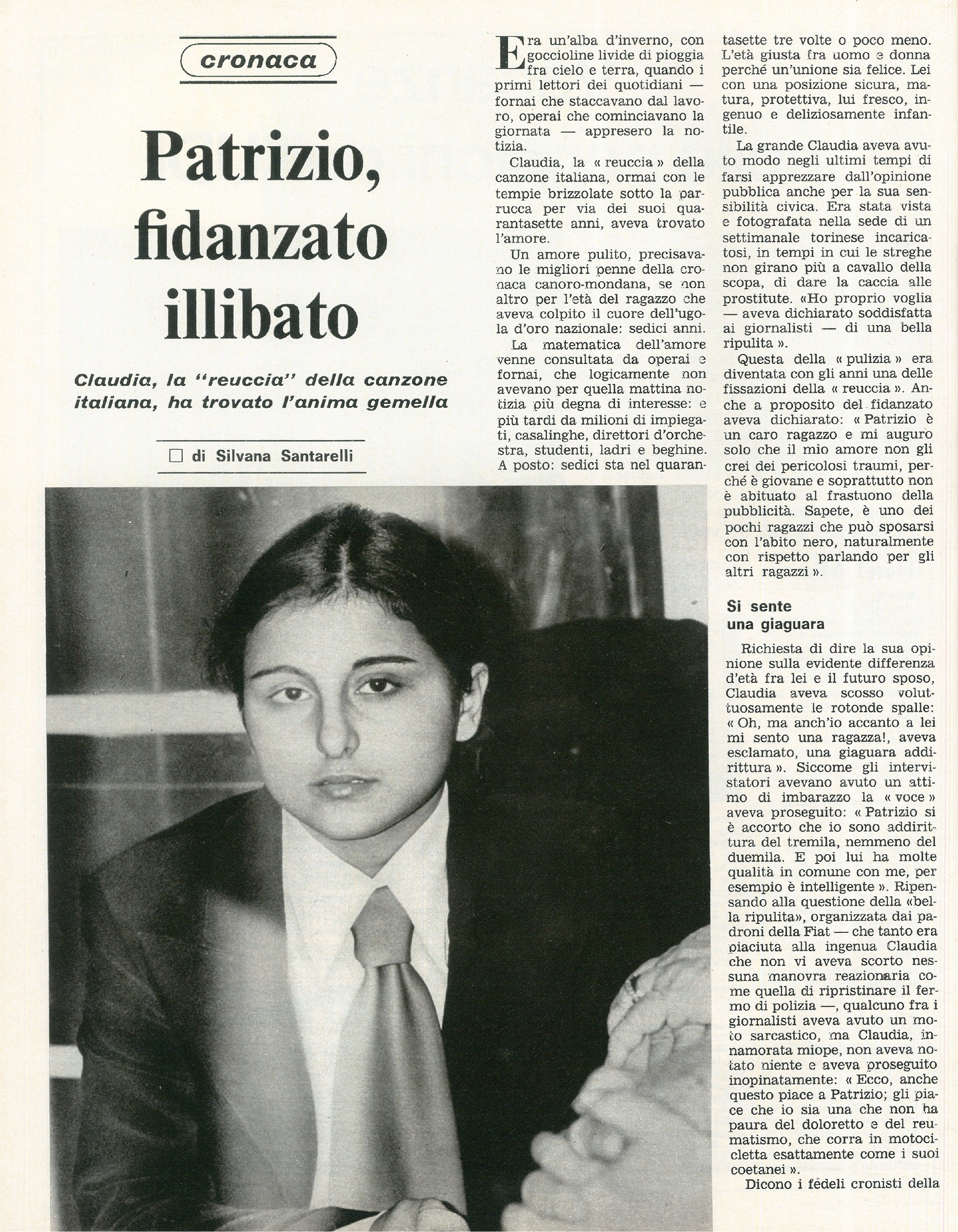“Patrizio, fidanzato illibato”: articolo satirico di Silvana Santarelli che inverte le parti di Claudio Villa e Patrizia Baldi, la sua fidanzata. Lui, “Patrizio”, è un giovane sedicenne puro e fresco, lei, “Claudia”, diva della canzone italiana e con una sicurezza sociale ed economica invidiale. La ricetta per la relazione perfetta.