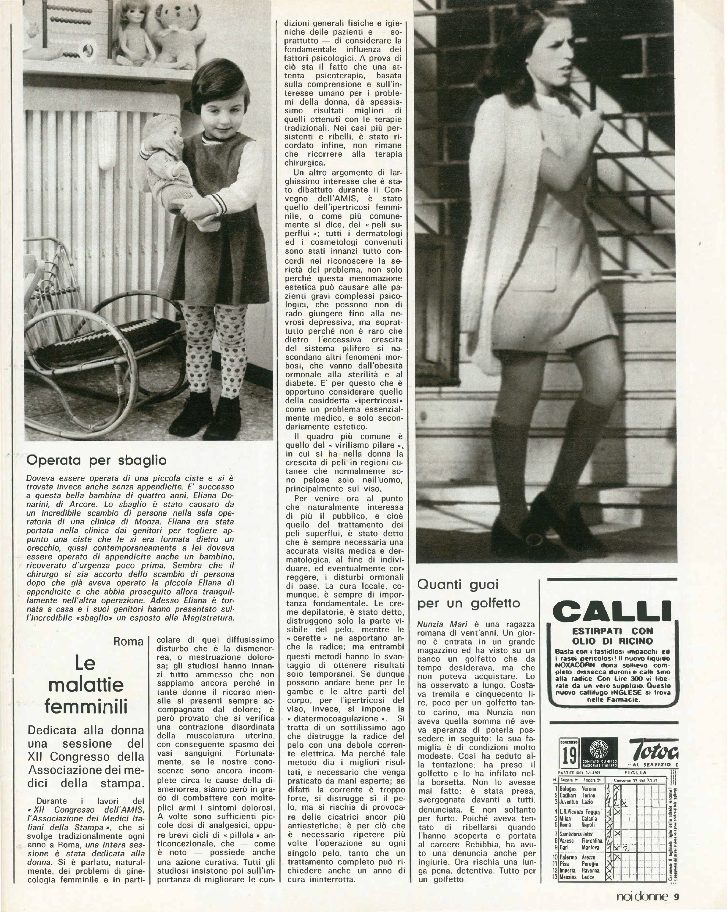 La donna in Italia: Scuole materne / Parte da Monfalcone la richiesta di gestirle direttamente considerandole un servizio sociale in considerazione del cattivo funzionamento degli istituti privati, spesso religiosi, che non garantiscono la continuità; la sollecitazione, anche dell’UDI, è che il Parlamento discuta al più presto le proposte di legge presentate da DC, PSI, PSIUP, PSU, PRI e DC. Roma: lotte dei genitori in zona Nomentana per destinare a scuola un immobile che si vorrebbe dare ad un privato. Roma: il XII congresso dell’Associazione dei Medici Italiana della Stampa (AMIS) è dedicato alle malattie femminili.