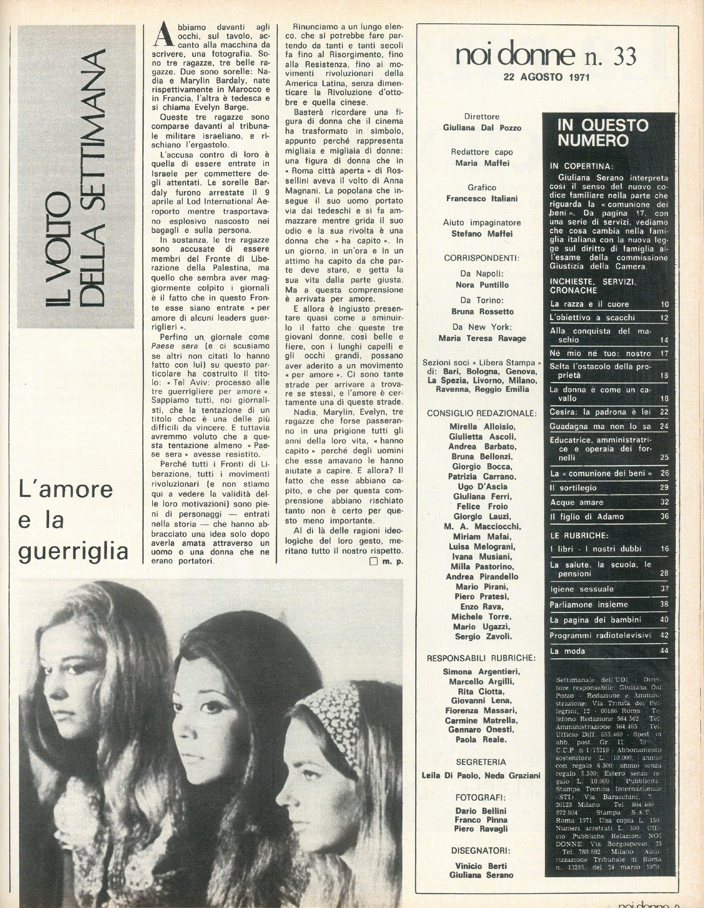 Il volto della settimana: il tribunale militare israeliano ha accusato tre ragazze di appartenere al Fronte di Liberazione della Palestina e di essere entrate in Israele per commettere degli attentati, dopo averle trovate con dell’esplosivo nascosto nei bagagli e addosso. I giornali italiani, però, sono rimasti colpiti più del fatto che le tre donne abbiano aderito al Fronte per amore che non che esse stessero effettivamente progettando un attentato.